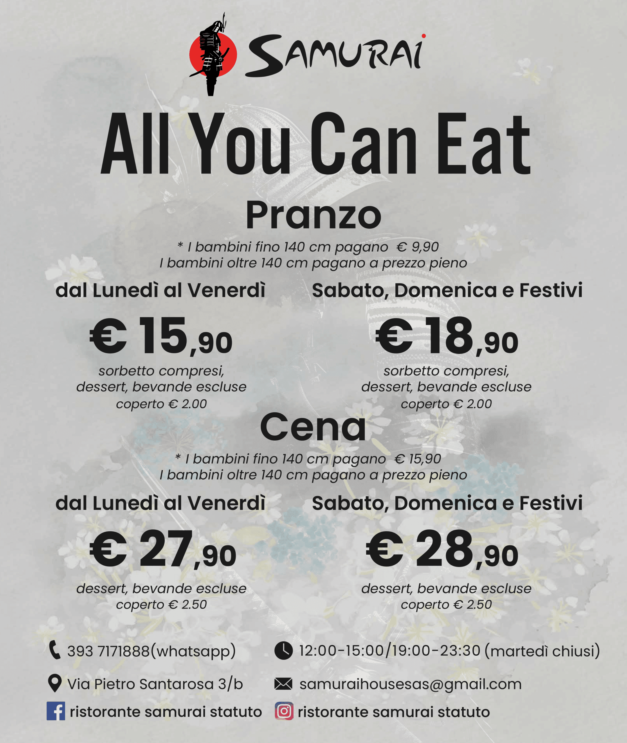 Scopri il nostro menu All You Can Eat, anche Take Away